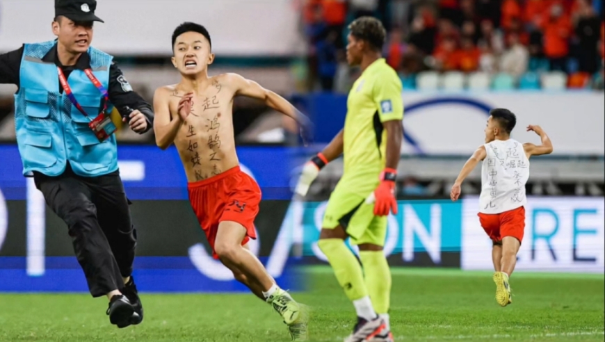 多角度实拍国足球迷冲场:跑向日本门将挑衅,身上写字被抬出场